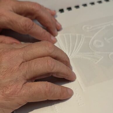 Un bénévole, étudiant en art ou professionnel de la culture ou artiste, décrit et souffle à l’oreille de la personne mal ou non-voyante, les éléments qui lui sont invisibles, le temps d’une exposition ou d’un spectacle.